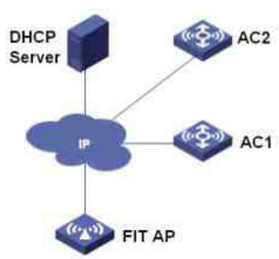 假设整网路由可达,AC1 管理 IP 地址为:192.168.10.1;AC2 管理 IP 地址为:192.168.10.2。FIT AP 与 AC1,AC2 之间通过三层网络连接,通过 Option 43 方式完成 FIT AP 注册。