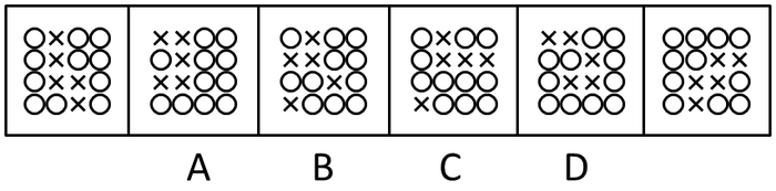 题干图形均由○和×图形构成,在数数找不到规律的基础上,考虑二者之间的特殊关系。观察发现,除了D选项,其他5个图形均由“×”图形将“○”图形分成了相离的两份。