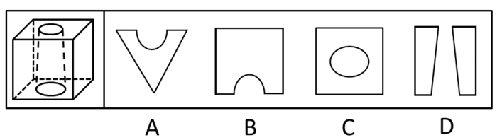 下列的立体图形是立方体中挖出一个圆锥台孔后形成的,如果从任一面剖开,以下哪一个不可能是该立体图形的截面: