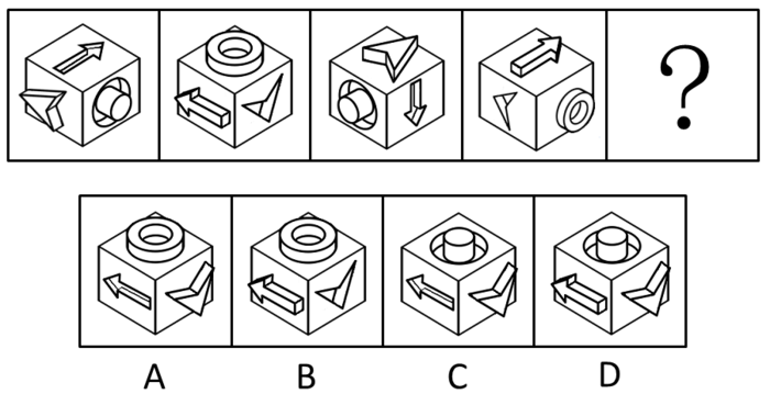 观察题干四幅图形,每相隔两幅图形所构成的立体图形元素相同,即①③相同,②④相同。且在①③中短箭头为立体图形,在②④中短箭头为平面图形。第五幅图形应与①③保持一致,选择短箭头为立体,长箭头为平面的图形,排除B、D;另一侧为圆柱形非圆筒形,只有C项符合。