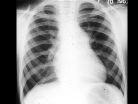 男孩,8岁。体检时发现胸骨左缘第2肋间有粗糙喷射性全收缩期杂音,向颈部传导,肺动脉瓣区第2音减弱。经右心导管检查,证实为中度肺动脉瓣狭窄。进行X线检查,如图所示,下列哪一项不是特点()