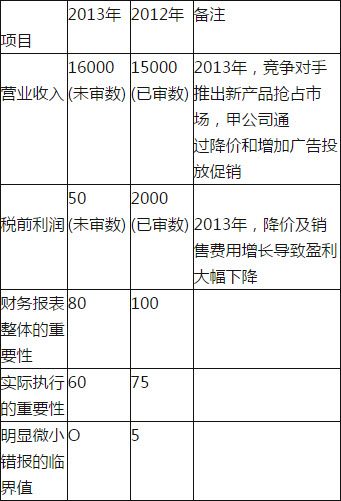 (1)2012年度财务报表整体的重要性以税前利润的5%计算。2013年,由于甲公司处于盈亏临界点,A注册会计师以过去了三年税前利润的平均值作为基准确定财务报表整体的重要性。