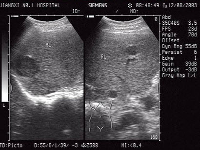 男,50岁,右上腹疼痛,乏力,纳差。结合超声声像图,诊断为() A.肝血吸虫病。 B.巨块型肝癌。 C.肝血管瘤。 D.肝脓肿。 E.肝囊肿。